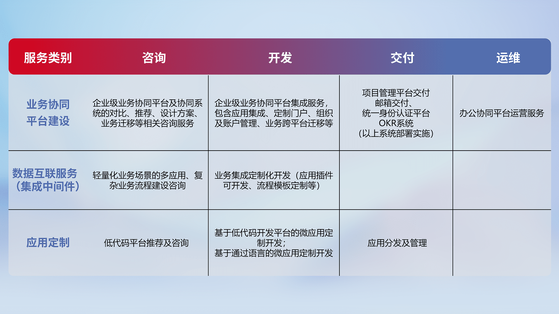 针对钉钉、、、企微、、、IDaas等平台级产品提供产品的规划、、、方案、、、交付、、、定制化开发等服务,,实现如统一协同办公、、、智能客户服务、、、混合会议管理、、、、智能数据查询、、、等业务场景,,,,实现数字化转型。。。