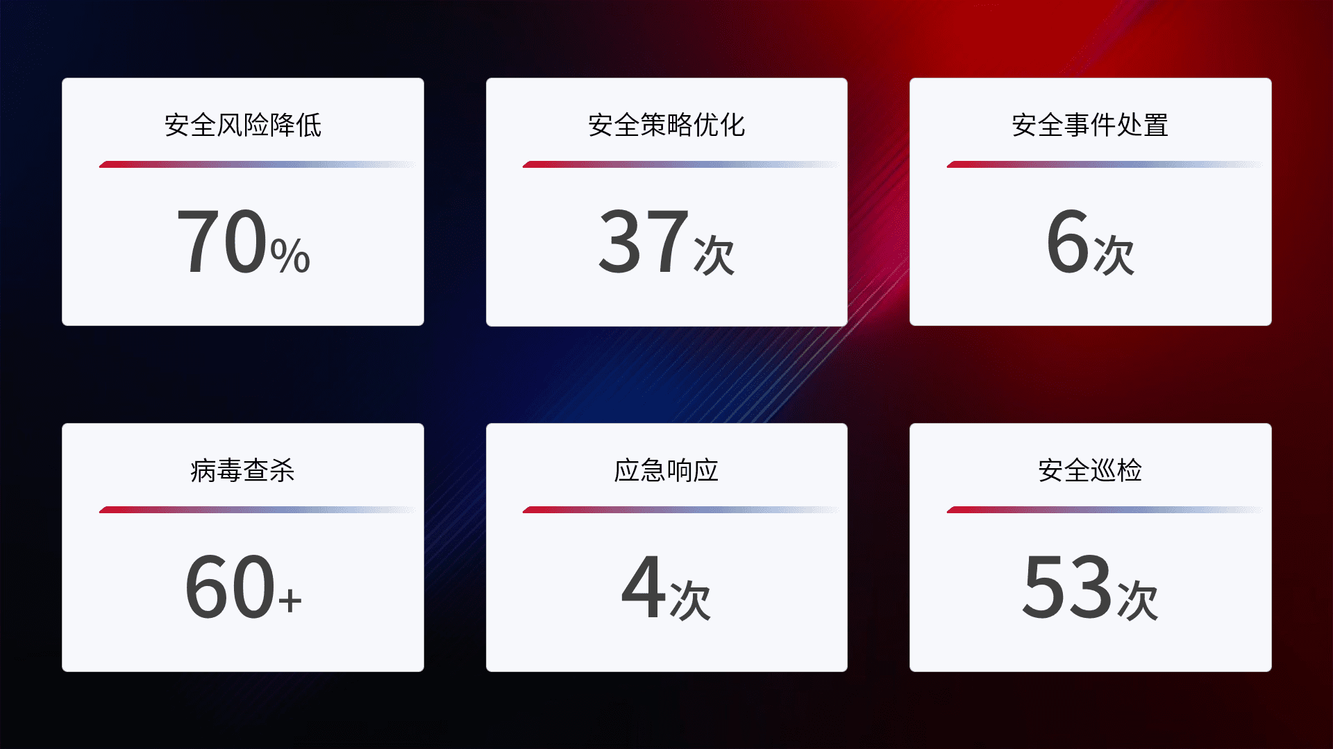提供全面的安全事件报告体系,,,包括处置报告、、、、周报、、、季度和年度总结,,结合持续监控,,帮助客户深入了解网络安全状况。。