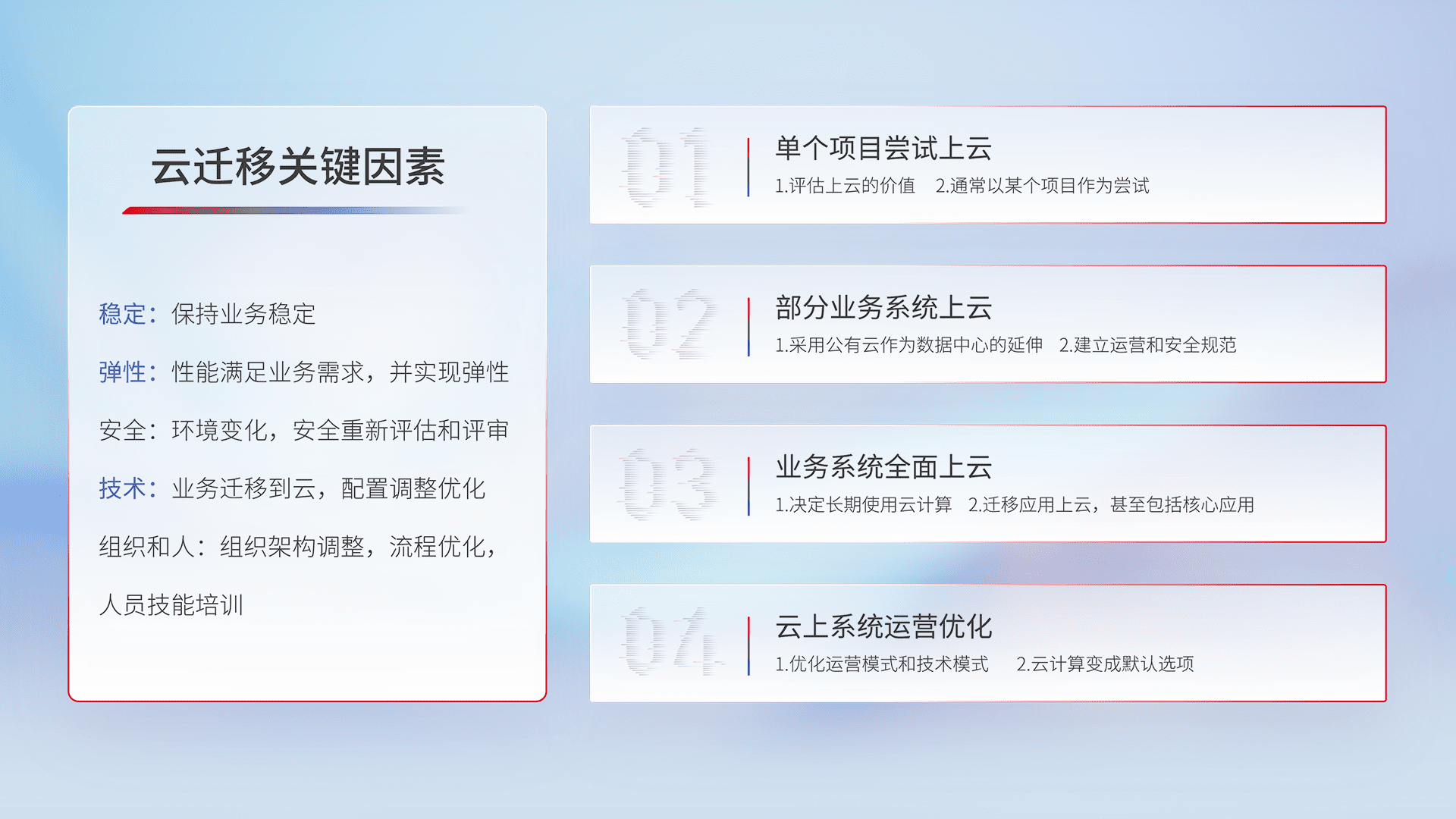 结合实际业务,,,,从规划设计、、、、云平台选型、、云原生改造、、数据迁移、、、集成交付,,迁移全过程为客户识别最佳上云路径,,做好风险识别管理,,,设计网络架构、、、、身份权限、、安全审计合规、、操作审计、、、日志审计、、、、监控告警策略、、、多站点容灾设计等,,,对云上基础设施进行整体规划,,,提升IT治理水平,,以满足弹性、、高可用、、、高性能的需求。。。