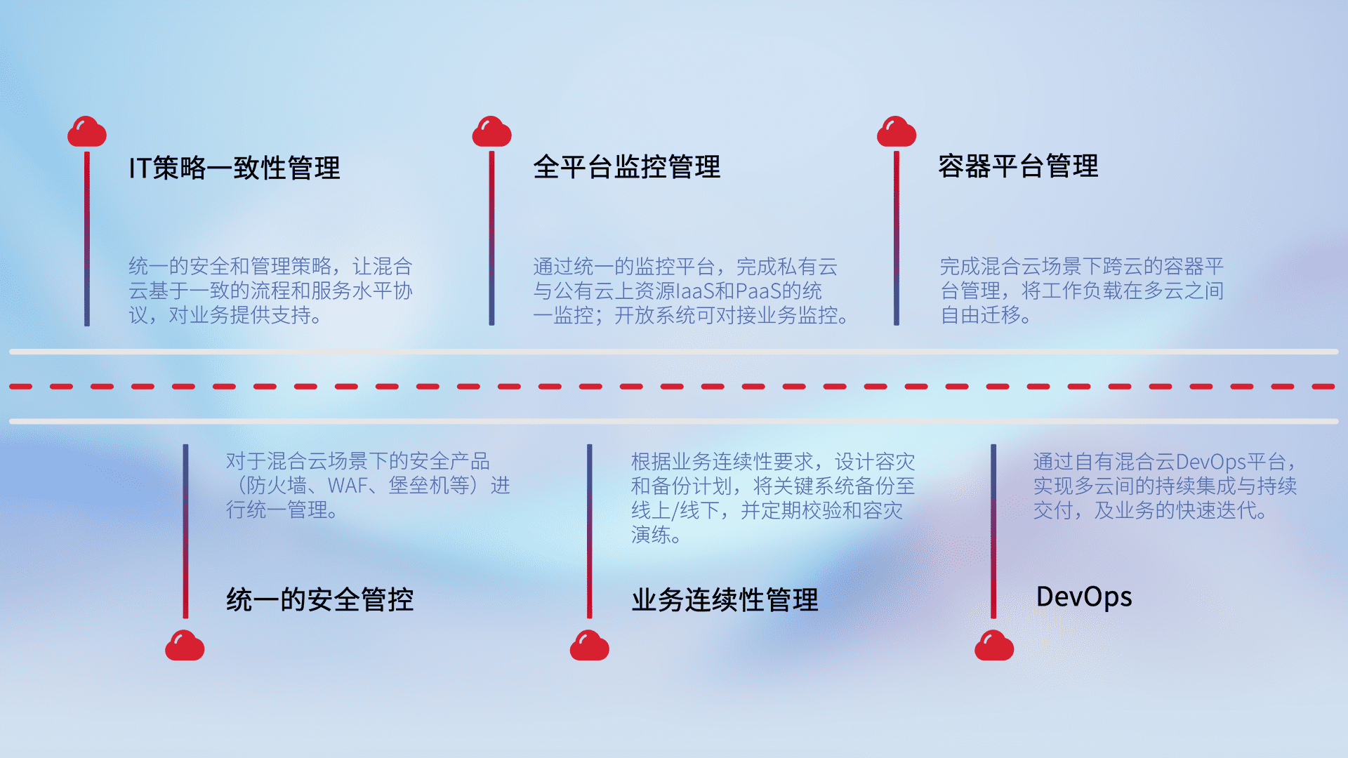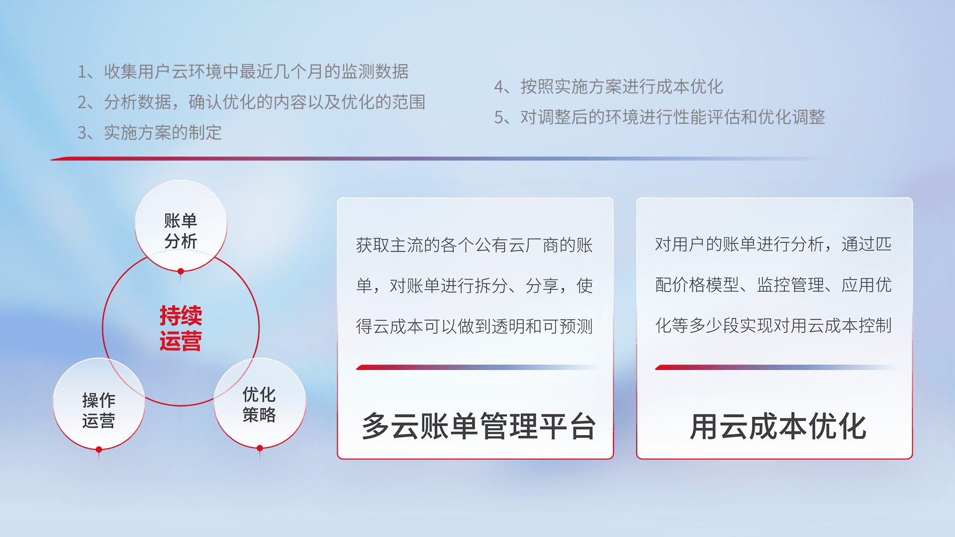 通过多云纳管,,,以统一的资源数据模型把客户的云资源进行抽象和封装,,,,进而实现对多云资源的统一操作,,保障云资源管理的可靠性、、、、稳定性与可用性。。量身定制化运维内容,,配置、、、开发运维、、补丁管理、、备份、、监控、、、、认证和访问管理、、审计和日常巡检等,,,,保障在用云过程中的可靠度,,,,稳定度以及高可用率。。。