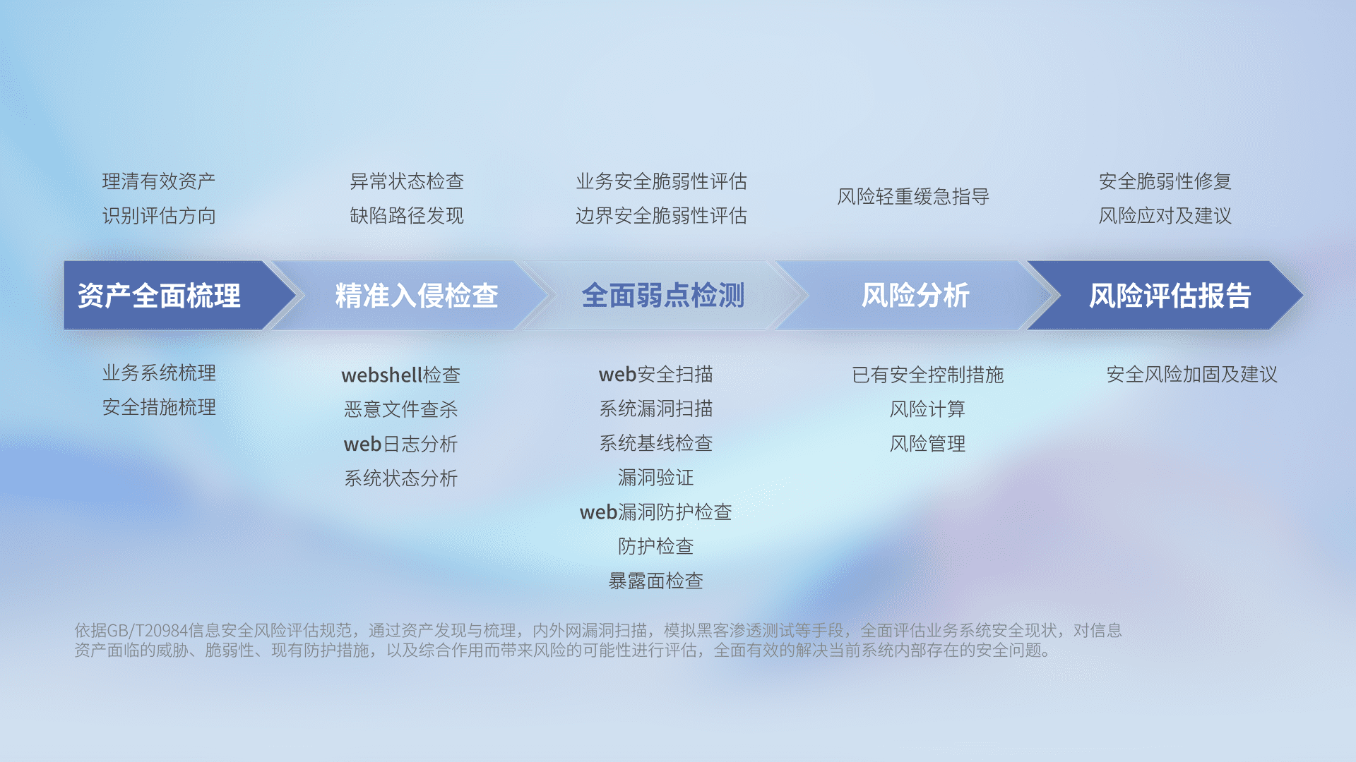 针对客户行业特性,,,以专业的安全服务+多厂商联合解决方案提供专属的一站式安全管理服务,,,帮助客户全面感知网络空间威胁,,,基于识别、、、检测、、分析、、、、防护、、、监测、、响应的服务理论模型,,,,从方案咨询、、、、集成交付、、评估验证、、优化加固、、运维运营,,,,致力于为客户提供完整的闭环管理式安全服务。。以实战经验为客户打造高抵御风险的安全体系,,帮助客户发现威胁、、、对抗威胁、、、、处置威胁,,,,不断积累安全对抗能力,,,,持续保障数字化安全。。。。